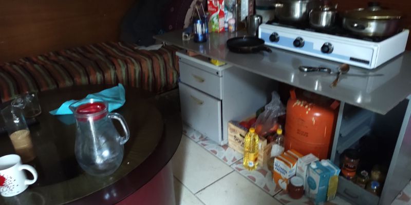 Dins l’habitacle, hi ha un fogó, alguns pots de menjar i un escàs mobiliari. Com a remor de fons, el sotragueig dels trens passant cada pocs minuts. No té calefacció ni aigua calenta, però aquestes necessitats bàsiques tampoc sembla que siguin el que més l’incomoda. Ell insisteix en la seva experiència com a treballador, i assegura que és un gran cuiner. Malgrat això, la seva dieta és poc variada i explica que ja fa dos dies que només menja llenties.